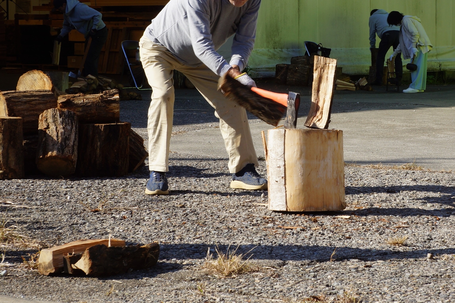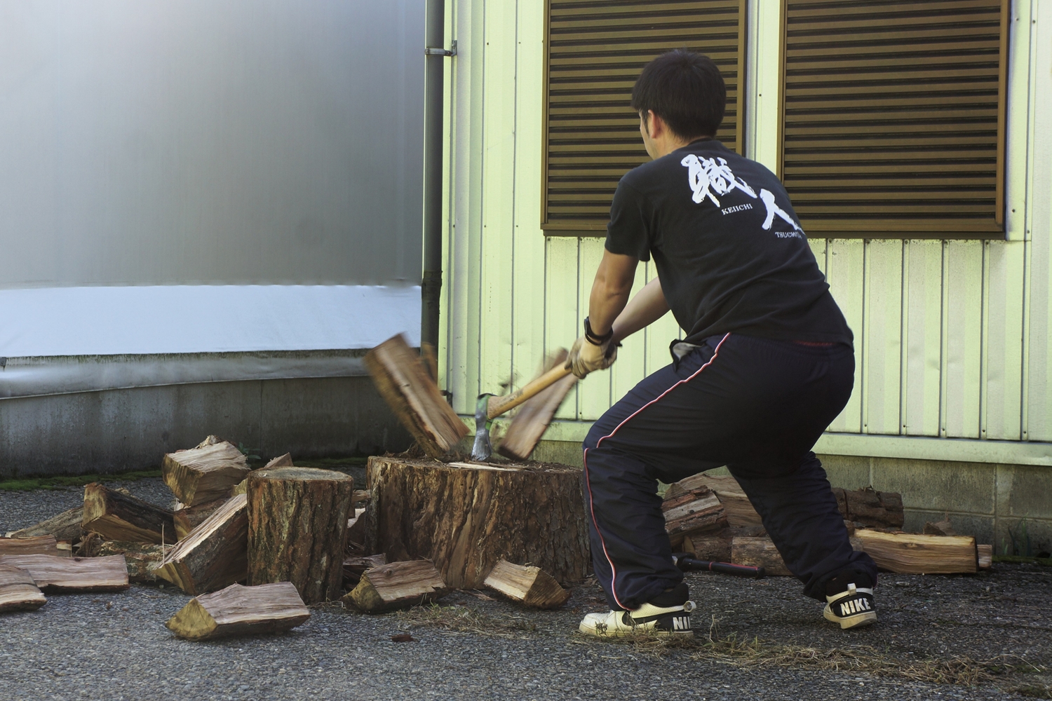 斧を振り上げ、膝を曲げて腰を落とし、薪に向かって振り下ろします。