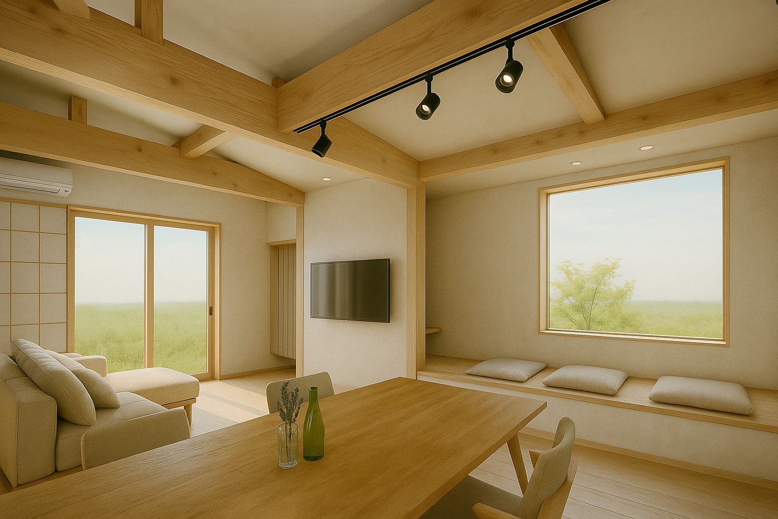 太い梁とピクチャーウィンドウがつくるのびやかな空間