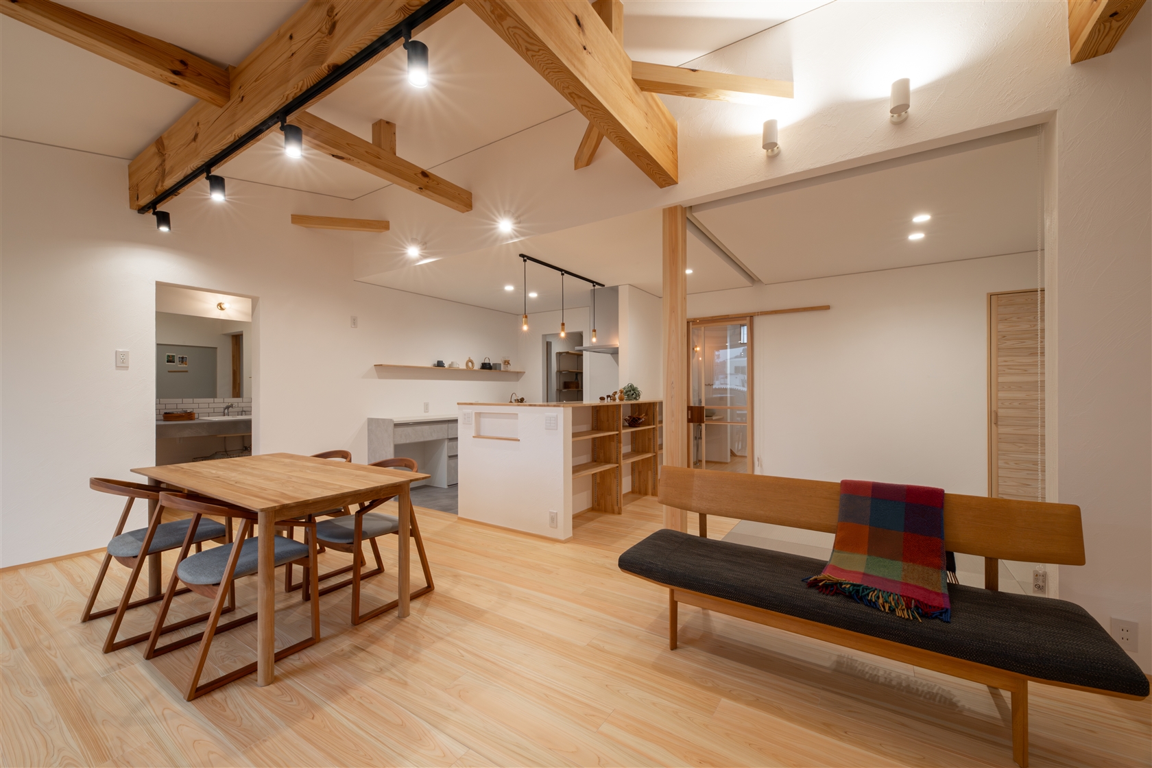 勾配天井で太い梁をあらわしにした、開放的なリビング